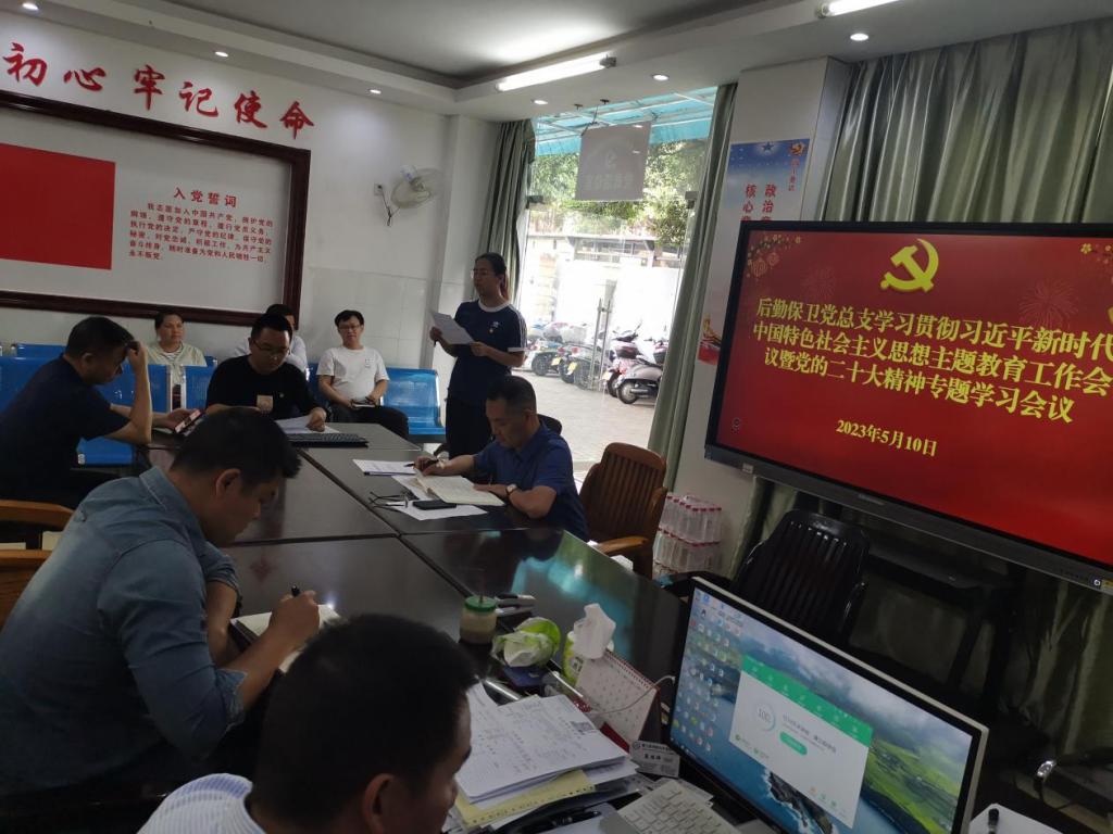 5月10日下午,后勤保卫党总支在1号综合楼1楼党员活动室召开学习贯彻习近平新时代中国特色社会主义思想主题教育工作会议暨党的二十大精神专题学习会议,会议由党总支书记黄敬文同志主持,后勤保卫党总支全体党员及入党积极分子参加学习会。
